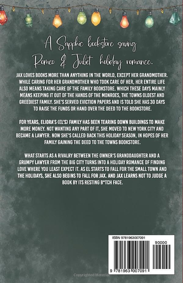 What starts as a rivalry between the owner's granddaughter and a grumpy lawyer from the big city turns into a holiday romance of finding love where you least expect it. As El starts to fall for the small town and the holidays, she also begins to fall for Jax. And Jax learns not to judge a book by its resting b*tch face.
