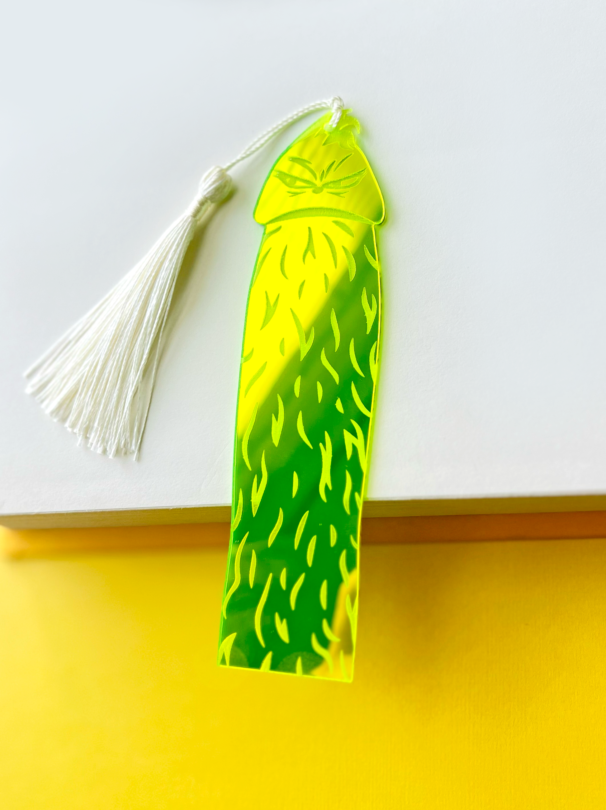 His heart(on) grew three sizes that year! Can't even believe it. Our favorite grumpy guy has turned into the Meanie Weenie on mirrored neon green acrylic. 5.5" x 1.5" x 1/16".