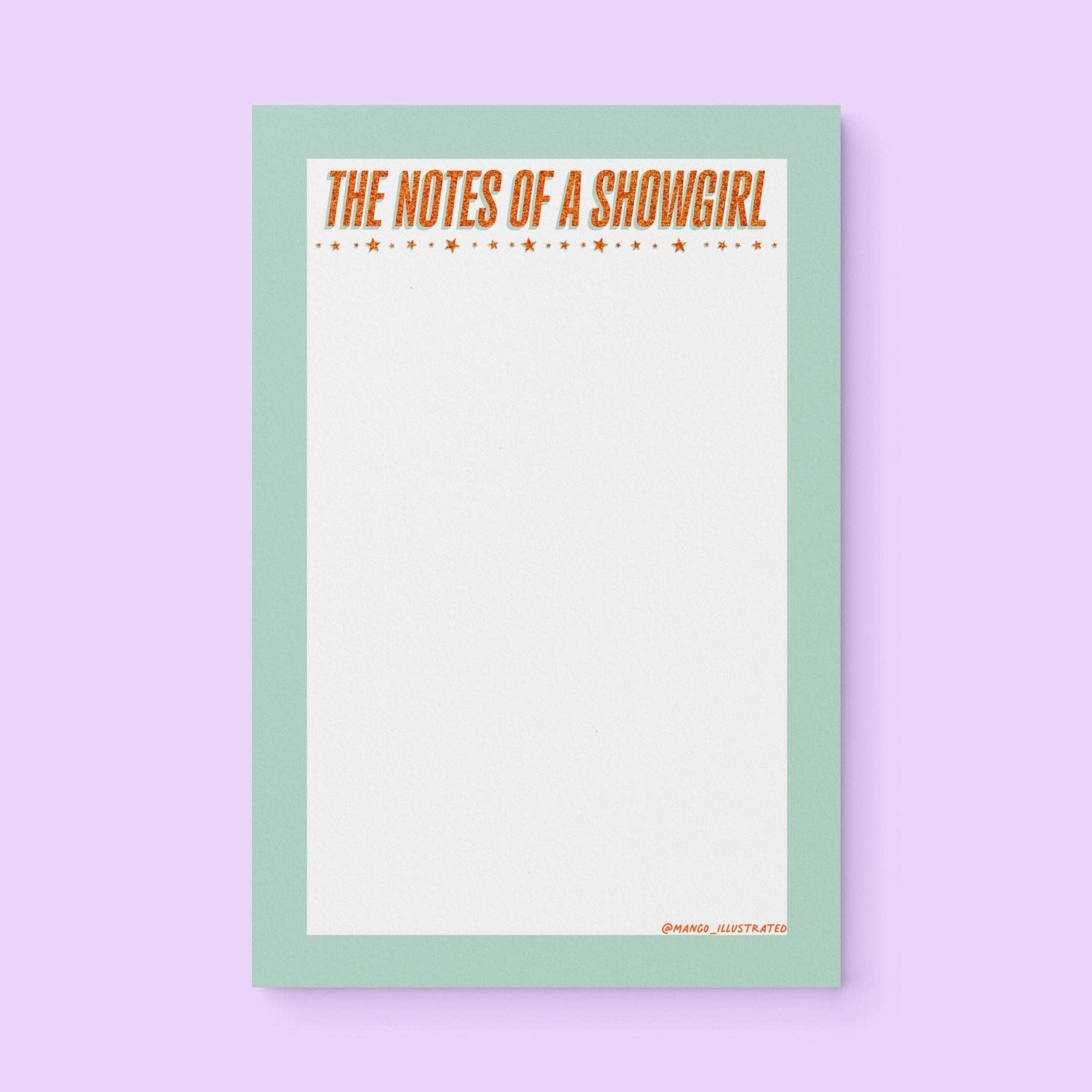 Bring a little stage-worthy sparkle to your everyday notes with our “The Notes of a Showgirl” notepad. With bold orange lettering framed by a soft mint green border, this chic stationery pad is perfect for jotting down daily tasks, creative ideas, journal entries, or glamorous to-do lists.