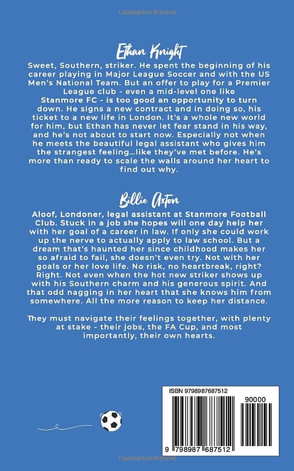Ethan Knight - sweet, Southern, striker. He spent the beginning of his career playing in Major League Soccer and with the US Men’s National Team. But an offer to play for a Premier League club - even a mid-level one like Stanmore FC - is too good an opportunity to turn down. He signs a new contract and in doing so, his ticket to a new life in London. It’s a whole new world for him, but Ethan has never let fear stand in his way, and he’s not about to start now. Especially not when he meets the beautiful legal assistant who gives him the strangest feeling…like they’ve met before. He’s more than ready to scale the walls around her heart to find out why.