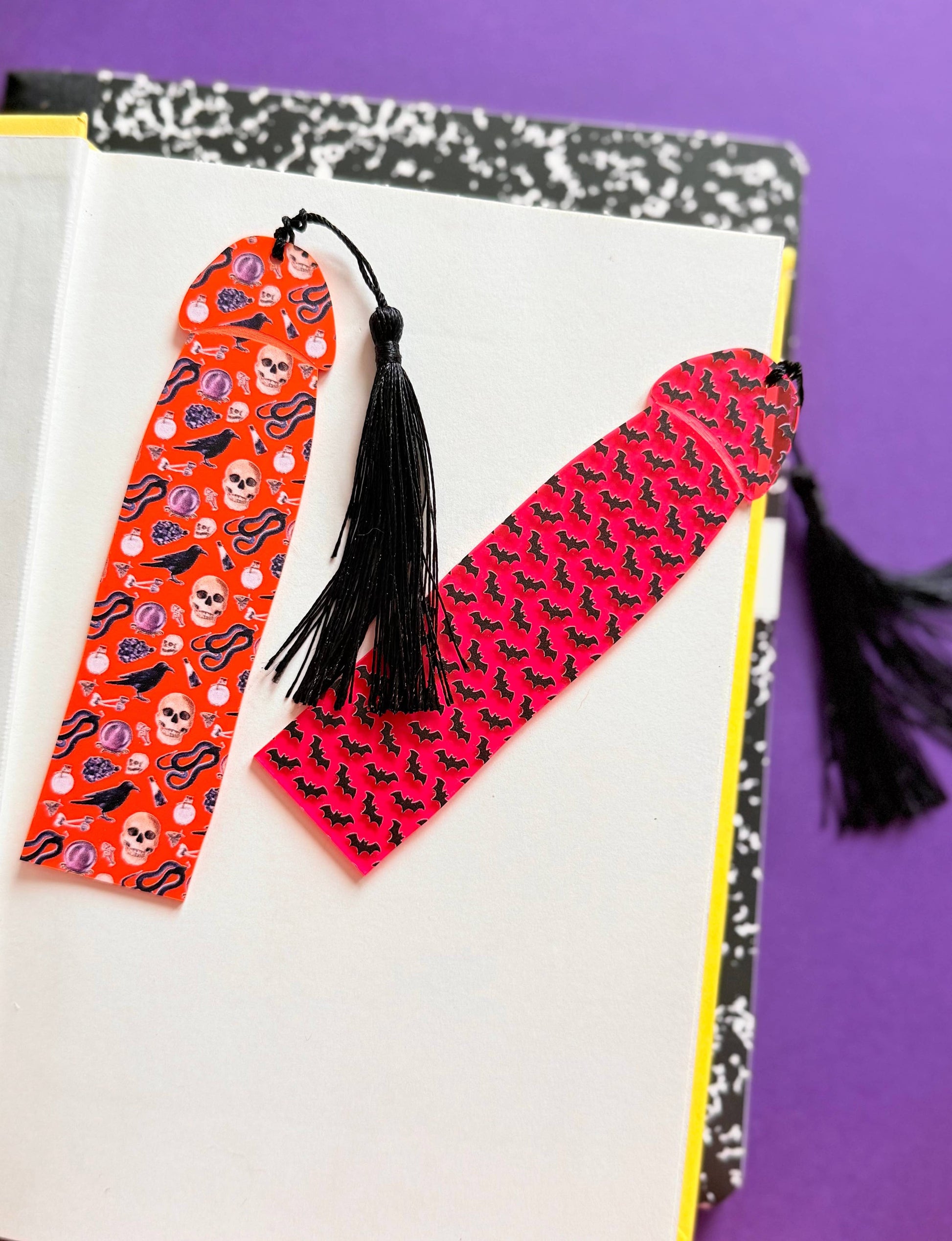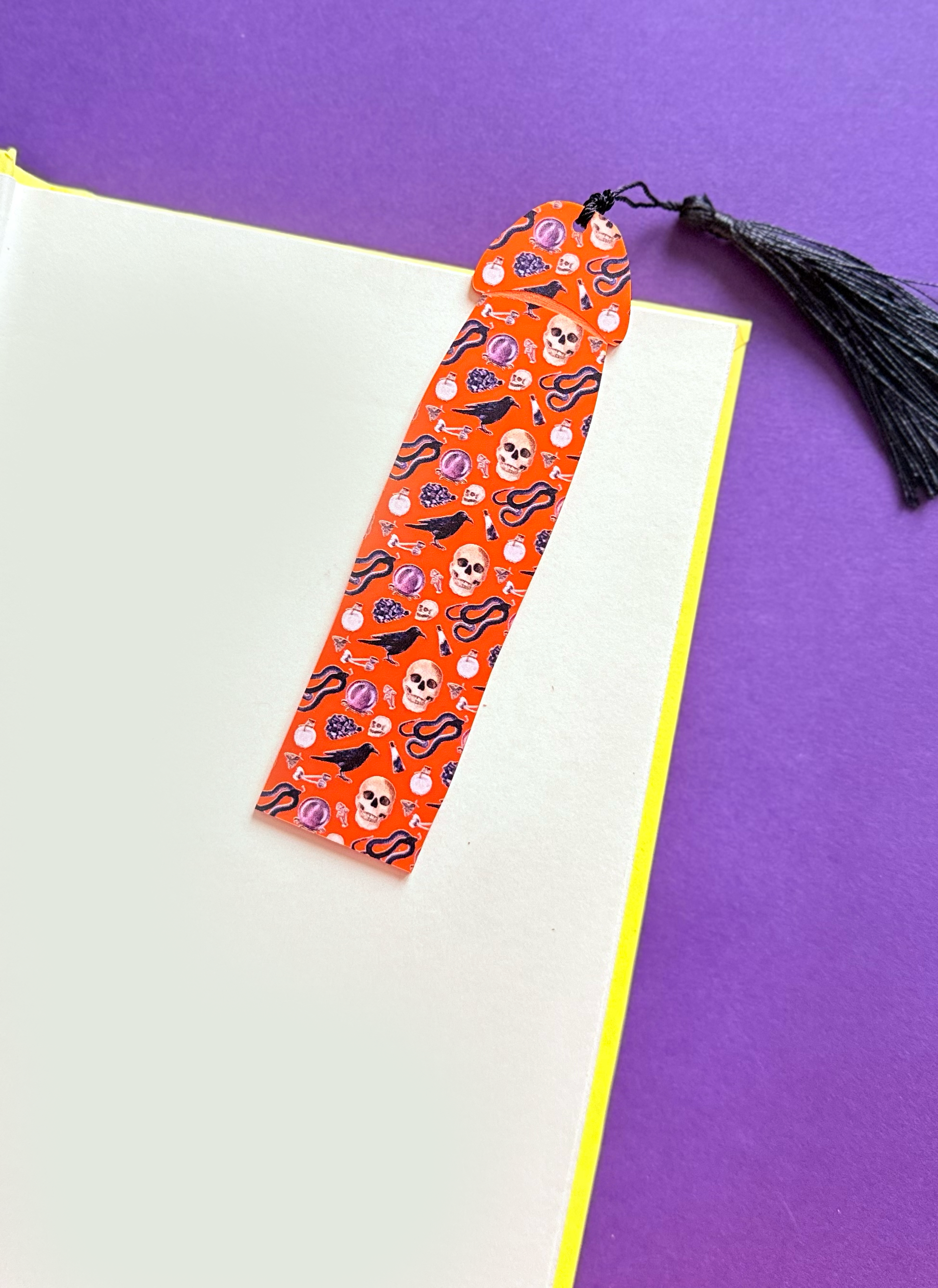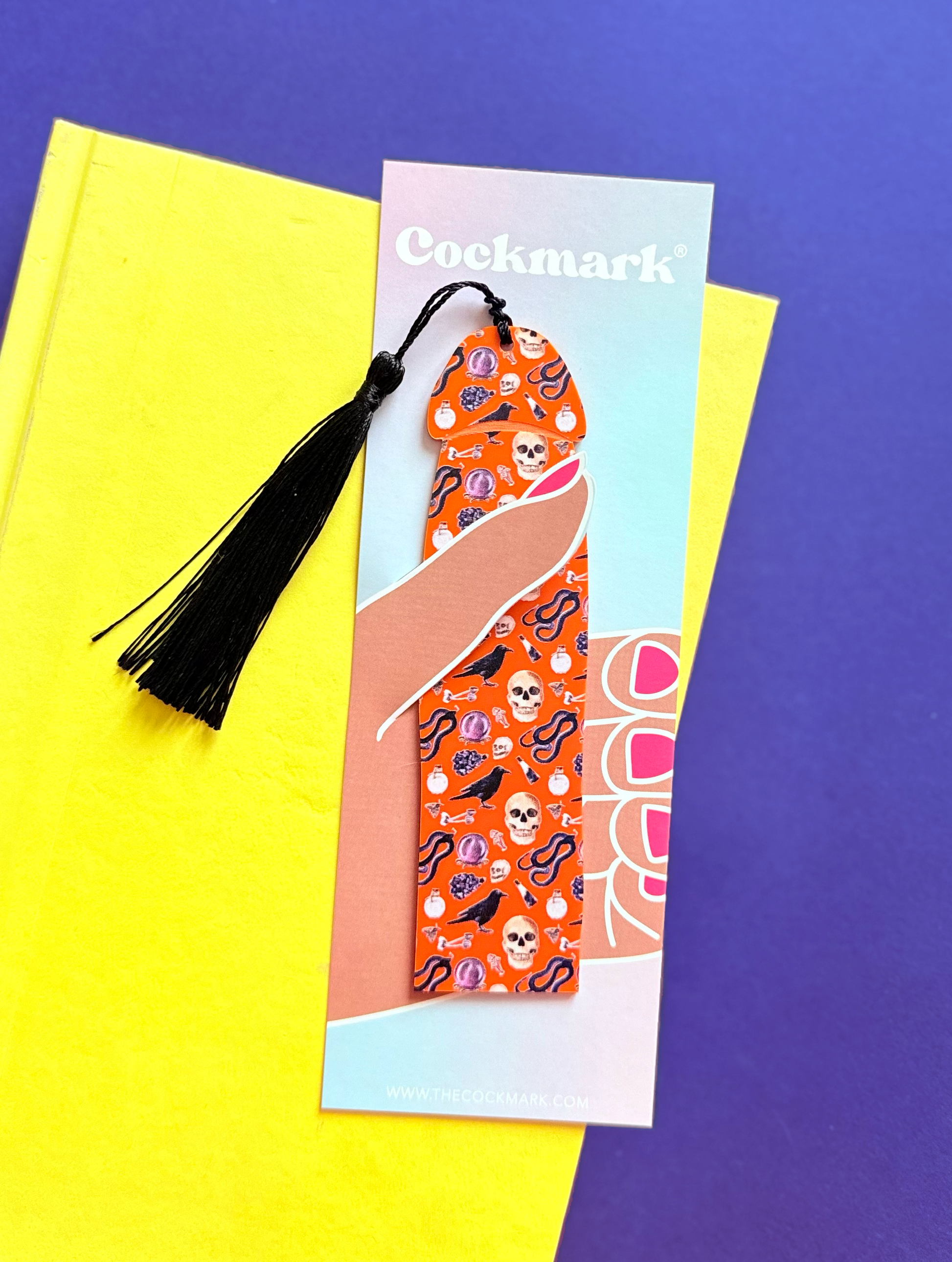 All the witchy themed things on this orange acrylic Cockmark! Topped with a black tassel. Cozied up in our iconic hand sleeve and cellophane packaging.